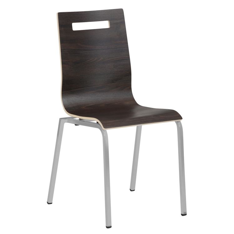 Gestell Chrom, Rechteckrohr, Sitz-/Rückenformschale aus durchgehendem Schichtholz mit Wenge-Laminat und Sichtholzkante, stapelbar (max. 5 Stühle), Sitzhöhe 46 cm.