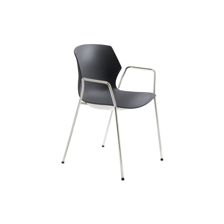 4-Fuß-Gestell Chrom, hochwertige Kunststoffschale graublau mit hohem Sitzkomfort, stapelbar (bis zu 6 Stühle), Sitzhöhe 46 cm. Armlehnen Chrom. Belastbar bis 150 kg.