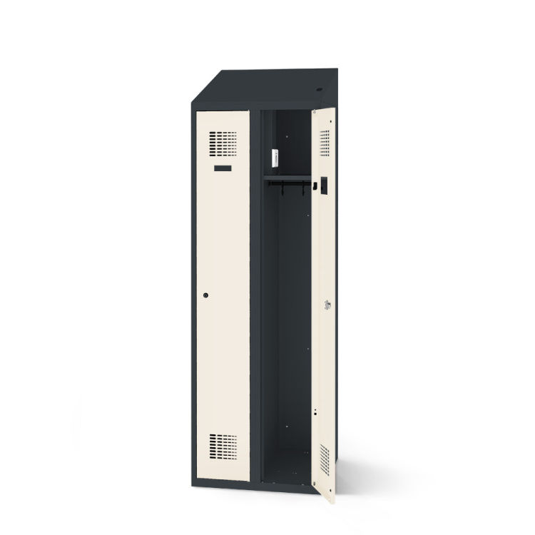 Die Qualität dieses Spinds zeigt sich in jedem Detail, von den verstärkten Türen bis zu den Gummipuffern und kräftigen Drehbolzen. Sie haben auch die Möglichkeit, den Spind nach Ihren Wünschen anzupassen, dank der verschiedenen Farb- und Ausstattungsvarianten.