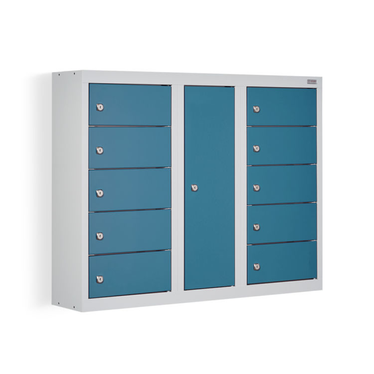 Die Ladestation besteht aus hochwertigem Qualitätsfeinblech mit einer Pulverbeschichtung in Lichtgrau (RAL 7035). Ihre abgerundeten Kanten und glatt einliegenden Türen gewährleisten Sicherheit und erleichtern die Reinigung. Die perforierte Rückseite sorgt für eine effiziente Luftzirkulation. Die Türen sind mit Gummipuffern und kräftigen Drehbolzen ausgestattet, die für angenehmes Schließen sorgen. Die Ladestation ist äußerst robust und verfügt über abgerundete Kanten für zusätzliche Sicherheit. Sie ist für die Wandmontage vorbereitet und kann optional mit einem Standfuß geliefert werden. Unser Produkt bietet vielfältige Schließsysteme für die Ladefächer, während das Servicefach standardmäßig mit einem Zylinderschloss ausgestattet ist.