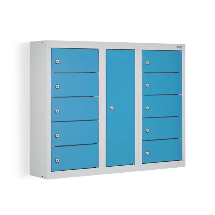 Die Ladestation besteht aus hochwertigem Qualitätsfeinblech mit einer Pulverbeschichtung in Lichtgrau (RAL 7035). Ihre abgerundeten Kanten und glatt einliegenden Türen gewährleisten Sicherheit und erleichtern die Reinigung. Die perforierte Rückseite sorgt für eine effiziente Luftzirkulation. Die Türen sind mit Gummipuffern und kräftigen Drehbolzen ausgestattet, die für angenehmes Schließen sorgen. Die Ladestation ist äußerst robust und verfügt über abgerundete Kanten für zusätzliche Sicherheit. Sie ist für die Wandmontage vorbereitet und kann optional mit einem Standfuß geliefert werden. Unser Produkt bietet vielfältige Schließsysteme für die Ladefächer, während das Servicefach standardmäßig mit einem Zylinderschloss ausgestattet ist.