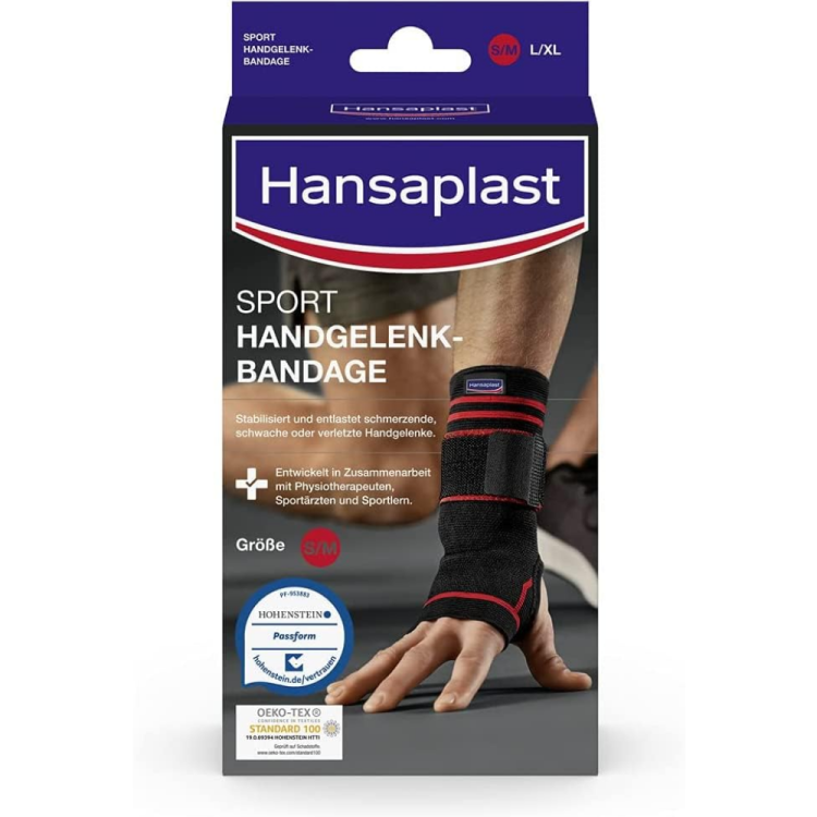 ProduktbeschreibungHansaplast Sport Handgelenk-Bandage in Größe S/M - stabilisiert und entlastet schwache oder verletzte HandgelenkeOb Sehnenscheidenentzündung, Karpaltunnelsyndrom, Verstauchung oder eine klassische Überlastung: Es gibt viele Gründe für schmerzende, schwache oder verletzte Handgelenke. Die Sport Handgelenk Bandage von Hansaplast wurde gezielt zur Kompression und Unterstützung der Gelenke entwickelt. Auf diese Weise können akute und chronische Schmerzen gelindert und neuen Verletzungen im Bereich des Handgelenks vorgebeugt werden.Dabei überzeugt die Bandage dank anpassbarem Stützband mit einer individuellen Passform und sorgt so für einen hohen Tragekomfort bei Bewegungen im Alltag, bei der Arbeit sowie beim Sport. Um besonders bei sportlichen Aktivitäten ein angenehmes Tragegefühl zu ermöglichen, besteht der Handgelenkschutz aus atmungsaktivem Funktionsmaterial.Die Gelenkstütze wurde in Zusammenarbeit mit Physiotherapeuten, Sportärzten und Sportlern entwickelt. Sie kann sowohl am linken als auch am rechten Handgelenk getragen werden.Die Produktqualität ist durch den Standard 100 von OEKO-TEX zertifiziert.Die Produktvorteile im Detail: Hansaplast Sport Handgelenk Bandage Stützt und entlastet Schmerzlindernd bei akuten und chronischen Schmerzen Anpassbares Stützband für kontrollierte Kompression Individuelle Passform Atmungsaktives Material Passend für das linke und rechte Handgelenk Waschbar In 2 Größen verfügbar Größe S/M (Gelenkumfang 15,0 - 18,0 cm)Anwendung:Die Bandage über das rechte/linke Handgelenk ziehen. Den Daumen durch die Öffnung führen, sodass sich das Polster an der Gelenk-Außenseite befindet. Den Handgelenkschutz hochziehen und mit dem zusätzlichen Stützband anpassen.WarnhinweiseAchtungAnschrift Hersteller/ImporteurUnnastrasse 48 20245 Hamburg