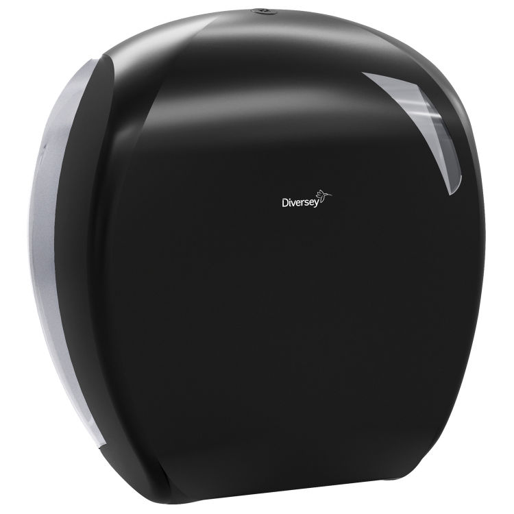 Spender für Jumbo-Toilettenpapierrollen Maxi; Material: Kunststoff; Farbe: schwarz/transparent; Grösse: 355 x 348 x 136 mm (HxBxT), Modernes und elegantes Design, geeignet für jede Umgebung, Hochwertige Materialien - ABS, MABS, POM, welche den Spender robust und langlebig machen, Verschließen mit Schlüssel verhindert Diebstahl und Manipulation, Transparenter Boden und Sichtfenster ermöglichen die Kontrolle des Papierfüllstands, Passendes Toilettenpapier: D7524329