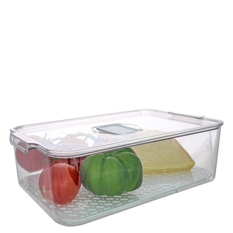 Stabile Aufbewahrungsbox mit Deckel und praktischem Ablaufgitter, Belüftung im Deckel, für handelsübliche Kühlschränke, aus hygienischem Kunststoff, Farbe: glasklar