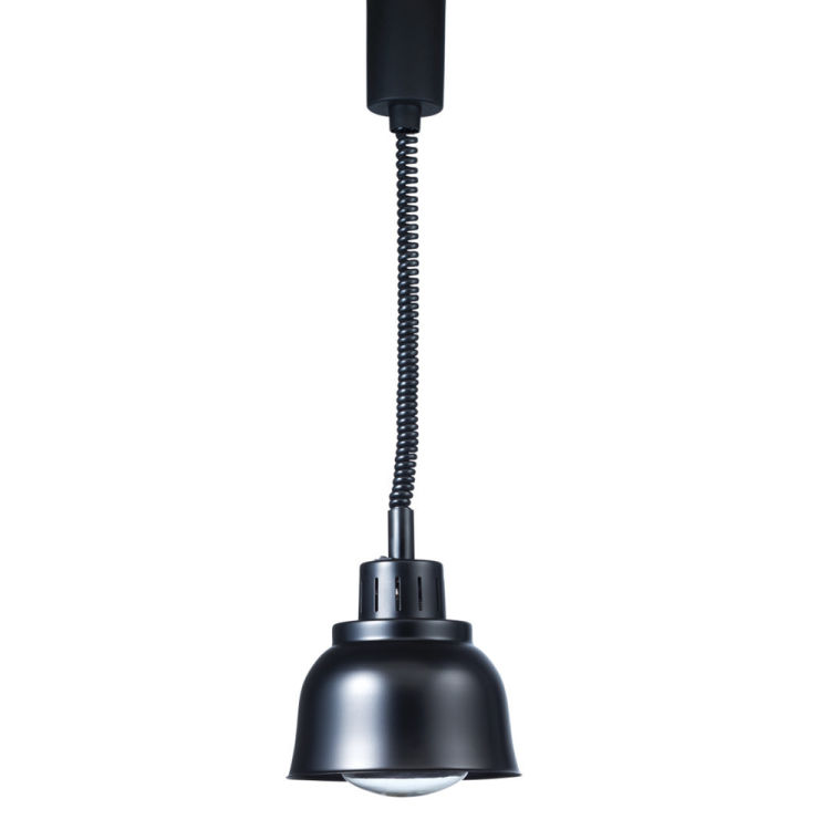 Strahlergehäuse, 240 mm Durchmesser, mit Spiralkabel, stufenlos verstellbar von 850 - 1700 mm, komplett mit 250 W-Infrarotstrahler (WEISSLICHT). Rosette 100 mm Durchmesser. Ein- und Ausschalter am Gehäuse. E-Anschluß: 230V/250W.