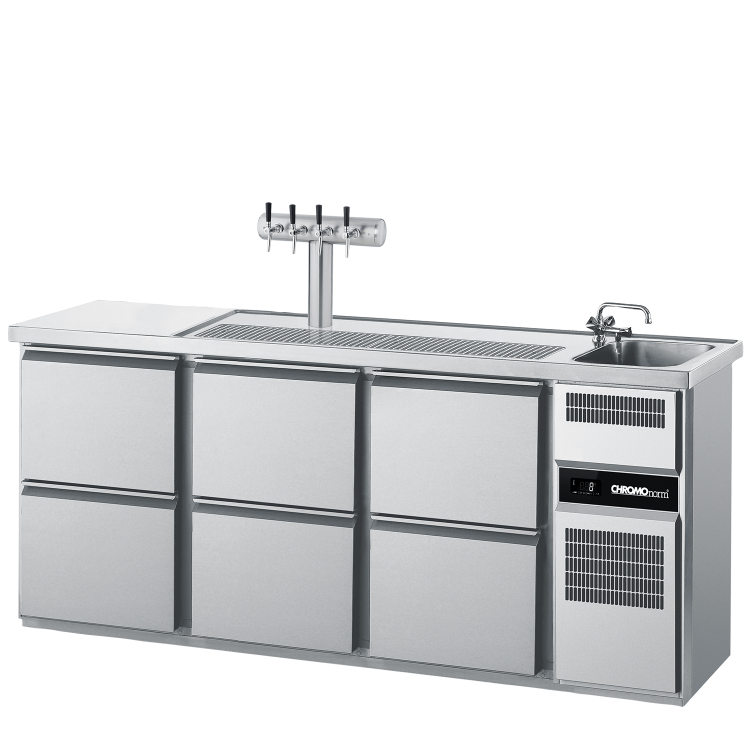 GETRÄNKETHEKE GN 1/1, 1 BECKEN RECHTS, 6 ZÜGE 1/2 . Abdeckung (50 mm) aus CNS 18/10, schalldämmend unterfüttert, allseits abgekantet, mit Wulstrand, Tropfmulde mit Ablauf und herausnehmbaren Abtropfblechen. 1 nahtlos eingeschweißtes Becken inklusive Ablaufverbindung mit Siphon und Standrohr 1 1/4'' mit Ventilsitz. Kühlkorpus in einem Stück hochdruckgeschäumt, innen und bedienseits außen aus Edelstahl, Rückseite und Seiten aus verzinktem Stahlblech. Maschinenfach aus Edelstahl. SteckerfertigeUmluftkühlung mit spezialbeschichtetem Mittelverdampfer, automatischer Abtauung, Tauwasserverdunstung und elektronischer Regelung mit Digitalanzeige. Kältemaschine für Servicezwecke beweglich montiert. Maschinenfachblende zur einfachen Kondensatorreinigung ohne Werkzeug demontierbar. Schubladenschilder jeweils in einem Stück hochdruckgeschäumt, mit integrierter Griffleiste und leicht auswechselbarer Magnet-Dichtung. Schubladen mit Teleskopauszügen aus Edelstahl, Nutzhöhe je 344 mm. 12 Schubladen-Trennstäbe als Zubehör. 2 Sockelprofile 40 mm hoch, jeweils längs vorn und hinten montiert. Lieferung erfolgt ohne Zapfsäule, Mischbatterie und Lochbohrungen. Mischbatterie als Mehrpreis erhältlich. Temperaturbereich +2 / +12 °C. Anschlusswert 440 W / 230 V / 50 Hz. Kältemittel R290. Kälteleistung 440 W -10 °C VT / +32 °C UT. Energieverbrauch 2,5 kWh/24h. Becken 300 x 500 x 300 mm. Abmessungen unverpackt (LxTxH) 2100 x 700 x 980 mm.