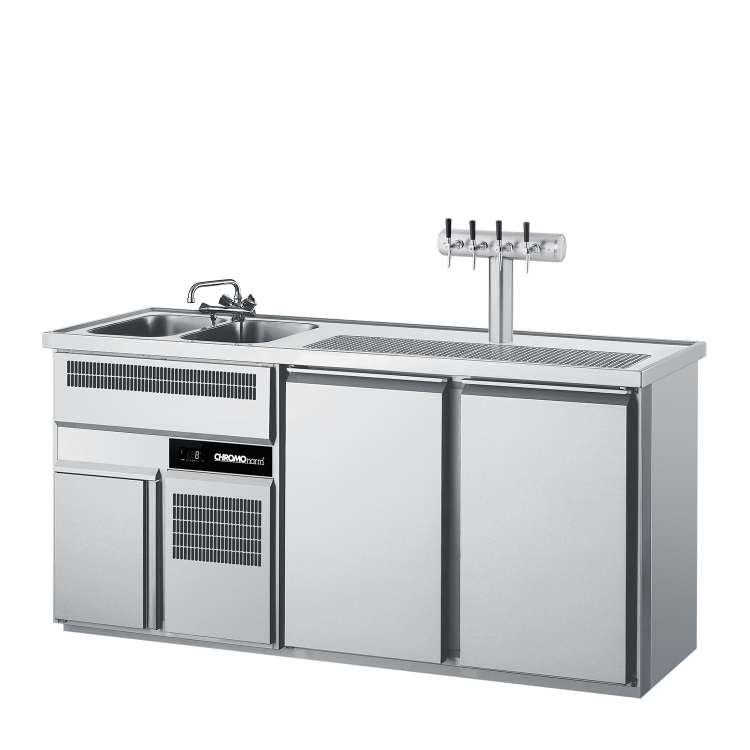 GETRÄNKETHEKE GN 1/1, 2 BECKEN LINKS, 2 TÜREN. Abdeckung (50 mm) aus CNS 18/10, schalldämmend unterfüttert, allseits abgekantet, mit Wulstrand, Tropfmulde mit Ablauf und herausnehmbaren Abtropfblechen. 2 nahtlos eingeschweißte Becken inklusive 1 Ablaufverbindung mit Siphon und je 1 Standrohr 1 1/4'' mit Ventilsitz. Kühlkorpus in einem Stück hochdruckgeschäumt, innen und bedienseits außen aus Edelstahl, Rückseite und Seiten aus verzinktem Stahlblech. Maschinenfach aus Edelstahl. Steckerfertige Umluftkühlung mit spezialbeschichtetem Mittelverdampfer, automatischer Abtauung, Tauwasserverdunstung und elektronischer Regelung mit Digitalanzeige. Kältemaschine für Servicezwecke beweglich montiert. Maschinenfachblende zur einfachen Kondensatorreinigung ohne Werkzeug demontierbar. Flügeltüren jeweils in einem Stück hochdruckgeschäumt, mit integrierter Griffleiste und leicht auswechselbarer Magnet-Dichtung. 2 kippsichere höhenverstellbare U-Auflageschienenpaare und 2 rilsanierter Tragroste als Zubehör. 2 Sockelprofile 40 mm hoch, jeweils längs vorn und hinten montiert. Lieferung erfolgt ohne Zapfsäule, Mischbatterie und Lochbohrungen. Mischbatterie als Mehrpreis erhältlich. Temperaturbereich +2 / +12 °C. Anschlusswert 440 W / 230 V / 50 Hz. Kältemittel R290. Kälteleistung 440 W -10 °C VT / +32 °C UT. Energieverbrauch 1,9 kWh/24h. Becken 300 x 500 x 300 mm. Abmessungen unverpackt (LxTxH) 1950 x 700 x 980 mm.