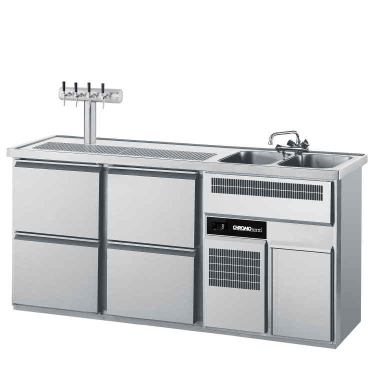 GETRÄNKETHEKE GN 1/1, 2 BECKEN RECHTS, 4 ZÜGE 1/2. Abdeckung (50 mm) aus CNS 18/10, schalldämmend unterfüttert, allseits abgekantet, mit Wulstrand, Tropfmulde mit Ablauf und herausnehmbaren Abtropfblechen. 2 nahtlos eingeschweißte Becken inklusive 1 Ablaufverbindung mit Siphon und je 1 Standrohr 1 1/4'' mit Ventilsitz. Kühlkorpus in einem Stück hochdruckgeschäumt, innen und bedienseits außen aus Edelstahl, Rückseite und Seiten aus verzinktem Stahlblech. Maschinenfach aus Edelstahl. SteckerfertigeUmluftkühlung mit spezialbeschichtetem Mittelverdampfer, automatischer Abtauung, Tauwasserverdunstung und elektronischer Regelung mit Digitalanzeige. Kältemaschine für Servicezwecke beweglich montiert. Maschinenfachblende zur einfachen Kondensatorreinigung ohne Werkzeug demontierbar. Schubladenschilder jeweils in einem Stück hochdruckgeschäumt, mit integrierter Griffleiste und leicht auswechselbarer Magnet-Dichtung. Schubladen mit Teleskopauszügen aus Edelstahl, Nutzhöhe je 344 mm. 8 Schubladen-Trennstäbe als Zubehör. 2 Sockelprofile 40 mm hoch, jeweils längs vorn und hinten montiert. Lieferung erfolgt ohne Zapfsäule, Mischbatterie und Lochbohrungen. Mischbatterie als Mehrpreis erhältlich. Temperaturbereich +2 / +12 °C. Anschlusswert 440 W / 230 V / 50 Hz. Kältemittel R290. Kälteleistung 440 W -10 °C VT / +32 °C UT. Energieverbrauch 1,9 kWh/24h. Becken 300 x 500 x 300 mm. Abmessungen unverpackt (LxTxH) 1950 x 700 x 980 mm.