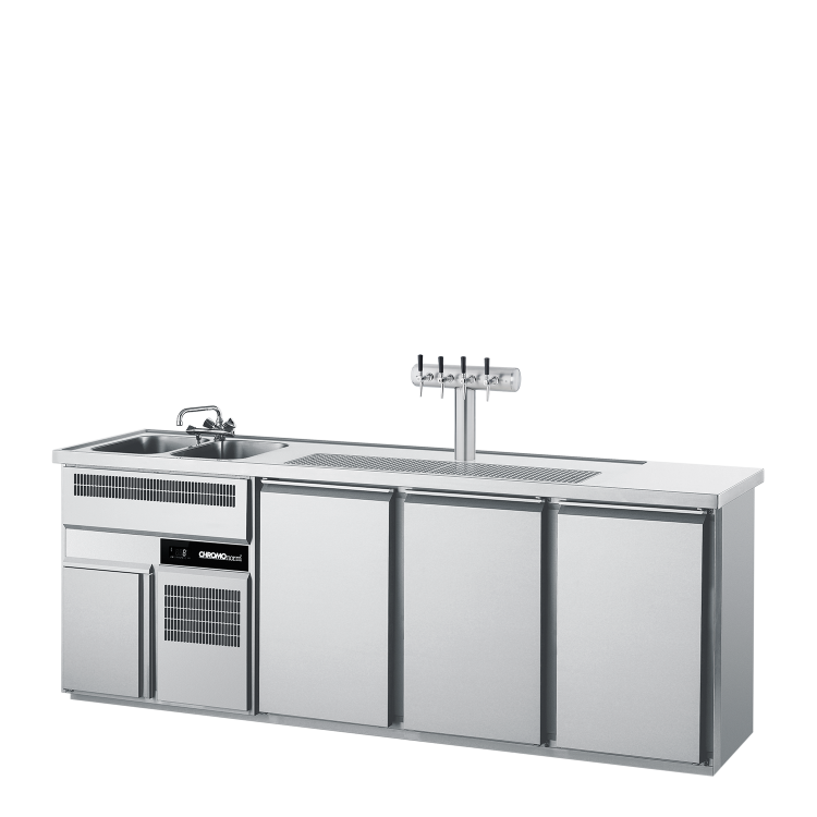 GETRÄNKETHEKE GN 1/1, 2 BECKEN LINKS, 3 TÜREN. Abdeckung (50 mm) aus CNS 18/10, schalldämmend unterfüttert, allseits abgekantet, mit Wulstrand, Tropfmulde mit Ablauf und herausnehmbaren Abtropfblechen. 2 nahtlos eingeschweißte Becken inklusive 1 Ablaufverbindung mit Siphon und je 1 Standrohr 1 1/4'' mit Ventilsitz. Kühlkorpus in einem Stück hochdruckgeschäumt, innen und bedienseits außen aus Edelstahl, Rückseite und Seiten aus verzinktem Stahlblech. Maschinenfach aus Edelstahl. SteckerfertigeUmluftkühlung mit spezialbeschichtetem Mittelverdampfer, automatischer Abtauung, Tauwasserverdunstung und elektronischer Regelung mit Digitalanzeige. Kältemaschine für Servicezwecke beweglich montiert. Maschinenfachblende zur einfachen Kondensatorreinigung ohne Werkzeug demontierbar. Flügeltüren jeweils in einem Stück hochdruckgeschäumt, mit integrierter Griffleiste und leicht auswechselbarer Magnet-Dichtung. 3 kippsichere höhenverstellbare U-Auflageschienenpaare und 3 rilsanierter Tragroste als Zubehör. 2 Sockelprofile 40 mm hoch, jeweils längs vorn und hinten montiert. Lieferung erfolgt ohne Zapfsäule, Mischbatterie und Lochbohrungen. Mischbatterie als Mehrpreis erhältlich. Temperaturbereich +2 / +12 °C. Anschlusswert 440 W / 230 V / 50 Hz. Kältemittel R290. Kälteleistung 440 W -10 °C VT / +32 °C UT. Energieverbrauch 2,5 kWh/24h. Becken 300 x 500 x 300 mm. Abmessungen unverpackt (LxTxH) 2500 x 700 x 980 mm.