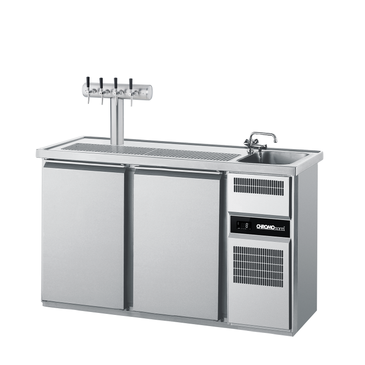 GETRÄNKETHEKE GN 1/1, 1 BECKEN RECHTS, 2 TÜREN. Abdeckung (50 mm) aus CNS 18/10, schalldämmend unterfüttert, allseits abgekantet, mit Wulstrand, Tropfmulde mit Ablauf und herausnehmbaren Abtropfblechen. 1 nahtlos eingeschweißtes Becken inklusive Ablaufverbindung mit Siphon und Standrohr 1 1/4'' mit Ventilsitz. Kühlkorpus in einem Stück hochdruckgeschäumt, innen und bedienseits außen aus Edelstahl, Rückseite und Seiten aus verzinktem Stahlblech. Maschinenfach aus Edelstahl. Steckerfertige Umluftkühlung mit spezialbeschichtetem Mittelverdampfer, automatischer Abtauung, Tauwasserverdunstung und elektronischer Regelung mit Digitalanzeige. Kältemaschine für Servicezwecke beweglich montiert. Maschinenfachblende zur einfachen Kondensatorreinigung ohne Werkzeug demontierbar. Flügeltüren jeweils in einem Stück hochdruckgeschäumt, mit integrierter Griffleiste und leicht auswechselbarer Magnet-Dichtung. 2 kippsichere höhenverstellbare U-Auflageschienenpaare und 2 rilsanierte Tragroste als Zubehör. 2 Sockelprofile 40 mm hoch, jeweils längs vorn und hinten montiert. Lieferung erfolgt ohne Zapfsäule, Mischbatterie und Lochbohrungen. Mischbatterie als Mehrpreis erhältlich. Temperaturbereich +2 / +12 °C. Anschlusswert 440 W / 230 V / 50 Hz. Kältemittel R290. Kälteleistung 440 W -10 °C VT / +32 °C UT. Energieverbrauch 1,9 kWh/24h. Becken 300 x 500 x 300 mm. Abmessungen unverpackt (LxTxH) 1550 x 700 x 980 mm.
