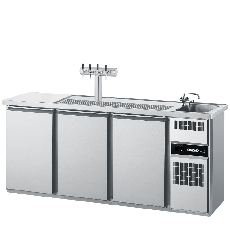 GETRÄNKETHEKE GN 1/1, 1 BECKEN RECHTS, 3 TÜREN. Abdeckung (50 mm) aus CNS 18/10, schalldämmend unterfüttert, allseits abgekantet, mit Wulstrand, Tropfmulde mit Ablauf und herausnehmbaren Abtropfblechen. 1 nahtlos eingeschweißtes Becken inklusive Ablaufverbindung mit Siphon und Standrohr 1 1/4'' mit Ventilsitz. Kühlkorpus in einem Stück hochdruckgeschäumt, innen und bedienseits außen aus Edelstahl, Rückseite und Seiten aus verzinktem Stahlblech. Maschinenfach aus Edelstahl. SteckerfertigeUmluftkühlung mit spezialbeschichtetem Mittelverdampfer, automatischer Abtauung, Tauwasserverdunstung und elektronischer Regelung mit Digitalanzeige. Kältemaschine für Servicezwecke beweglich montiert. Maschinenfachblende zur einfachen Kondensatorreinigung ohne Werkzeug demontierbar. Flügeltüren jeweils in einem Stück hochdruckgeschäumt, mit integrierter Griffleiste und leicht auswechselbarer Magnet-Dichtung. 3 kippsichere höhenverstellbare U-Auflageschienenpaare und 3 rilsanierte Tragroste als Zubehör. 2 Sockelprofile 40 mm hoch, jeweils längs vorn und hinten montiert. Lieferung erfolgt ohne Zapfsäule, Mischbatterie und Lochbohrungen. Mischbatterie als Mehrpreis erhältlich. Temperaturbereich +2 / +12 °C. Anschlusswert 440 W / 230 V / 50 Hz. Kältemittel R290. Kälteleistung 440 W -10 °C VT / +32 °C UT. Energieverbrauch 2,5 kWh/24h. Becken 300 x 500 x 300 mm. Abmessungen unverpackt (LxTxH) 2100 x 700 x 980 mm.