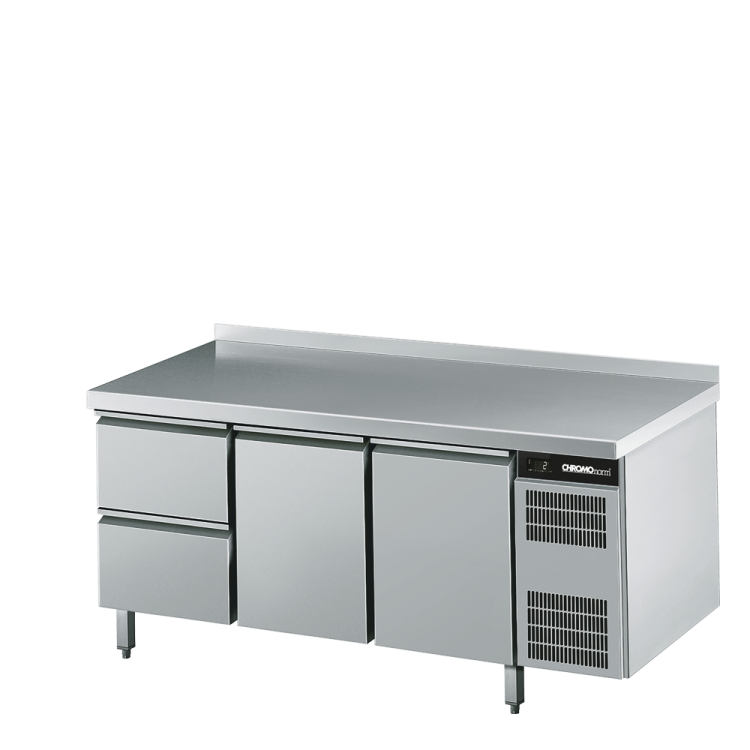 KÜHLTISCH GN 1/1, 2 ZÜGE 1/2, 2 TÜEN. Tischplatte (50 mm) aus CNS 18/10, schalldämmend unterfüttert und mit umlaufendem Profil verstärkt. Mit Aufkantung 50 mm hinten. Kühlkorpus in einem Stück hochdruckgeschäumt, innen und außen aus Edelstahl. Steckerfertige Umluftkühlung mit spezialbeschichtetem Deckenverdampfer, automatischer Abtauung, Tauwasserverdunstung und elektronischer Regelung mit Digitalanzeige. Kältemaschine für Servicezwecke beweglich montiert. Maschinenfachblende zur einfachen Kondensatorreinigung ohne Werkzeug demontierbar. Flügeltüren und Schubladenschilder jeweils in einem Stück hochdruckgeschäumt, mit integrierter Griffleiste und leicht auswechselbarer Magnet-Dichtung. Schubladen mit Teleskopauszüge aus Edelstahl, Nutzhöhe je 208 mm. Füße 150 mm hoch, höhenverstellbar +/- 20 mm. 2 kippsichere höhenverstellbare U-Auflageschienenpaare und 2 Tragroste GN 1/1 aus CNS 18/10 als Zubehör. Sockelbaufähig. Tischplatte abnehmbar. Temperaturbereich 0 / +12 °C. Anschlusswert 350 W / 230 V / 50 Hz. Kältemittel R290. Kälteleistung 300 W -10 °C VT. Energieverbrauch in 24h 2,80 kWh. Abmessungen unverpackt (LxTxH) 1725 x 700 x 850 mm.
