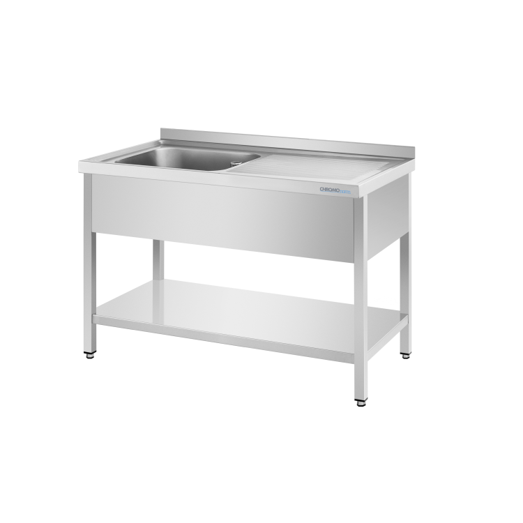 SPÜLTISCH MIT 1 BECKEN LINKS UND ZWISCHENBODEN. Spülenabdeckung (50 mm) aus CNS 18/10 mit Aufkantung 50 mm hinten mit Umschlag, tiefgezogener gerillter Abtropffläche, umlaufendem Wulstrand und 1 nahtlos eingeschweißtes Becken mit 3-seitiger Beckenverkleidung, inklusive 1 Standrohr 2'' mit Ventilsitz als Zubehör. Unterbau aus CNS 18/10, offen mit fest eingeschweißtem Zwischenboden, 150 mm über Fußboden. Arbeitshöhe 850-900 mm, variabel einstellbar. Niveauausgleich von -5 mm / +10 mm möglich. Lieferung erfolgt ohne Lochbohrungen, Ablaufverbindung und Mischbatterie. Mischbatterie als Mehrpreis erhältlich. Beckengröße 500 x 400 x 250 mm. Abmessungen unverpackt (LxTxH) 1200x600x850/900 mm.