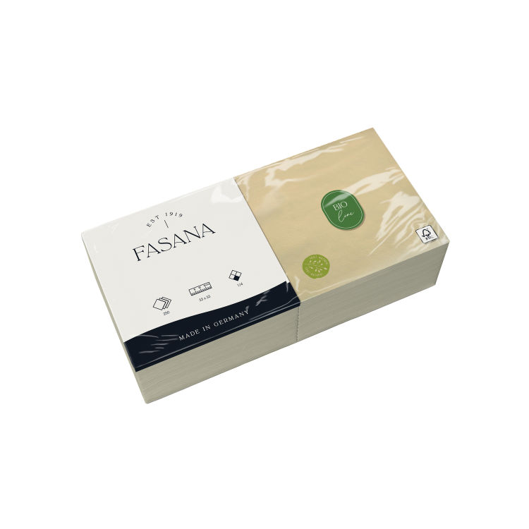 Servietten in naturbelassenem Farbton für eine umweltbewusste und nachhaltige Gastronomie in zwei Formaten. Ohne Zusatz von Bleichmitteln bei der Produktion. Mit wasserbasierten Farben bedruckt.
