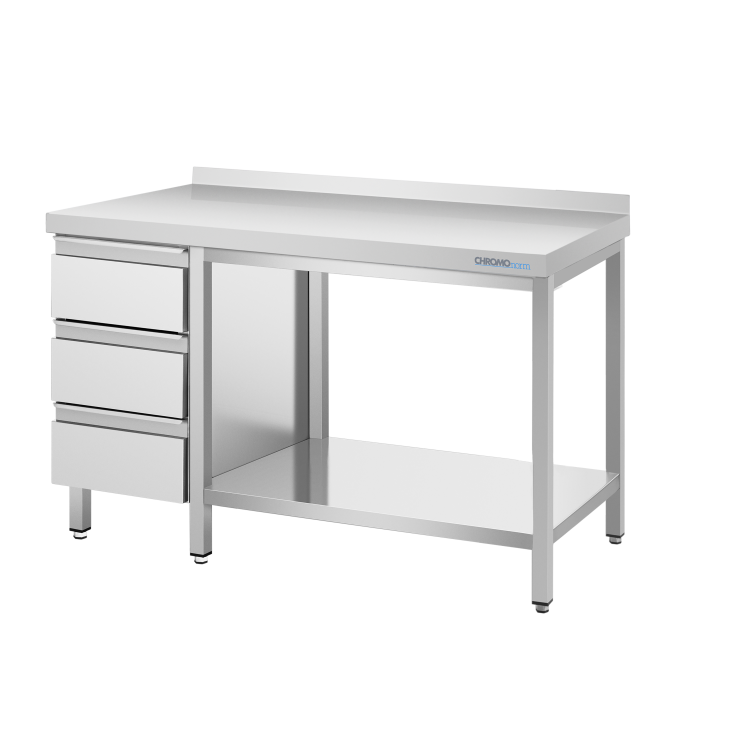 ARBEITSTISCH MIT ZWISCHENBODEN UND SCHUBLADENBLOCK LINKS, MIT TISCHPLATTE HINTEN AUF. Tischplatte (50 mm) aus CNS 18/10, schalldämmend unterfüttert und mit umlaufendem Profil verstärkt. Mit Aufkantung hinten 50 mm. Unterbau offen aus CNS 18/10, mit einem fest eingeschweißten Boden. Links ein Schubladenblock mit 3 Kastenschubladen (GN 1/1), mit integrierter Griffleiste, Auszüge aus Edelstahl, Nutzhöhe je 150 mm. Arbeitshöhe 850-900 mm, variabel einstellbar. Niveauausgleich von -5 mm / +10 mm möglich. Abmessungen unverpackt (LxTxH) 1800x700x850/900 mm.