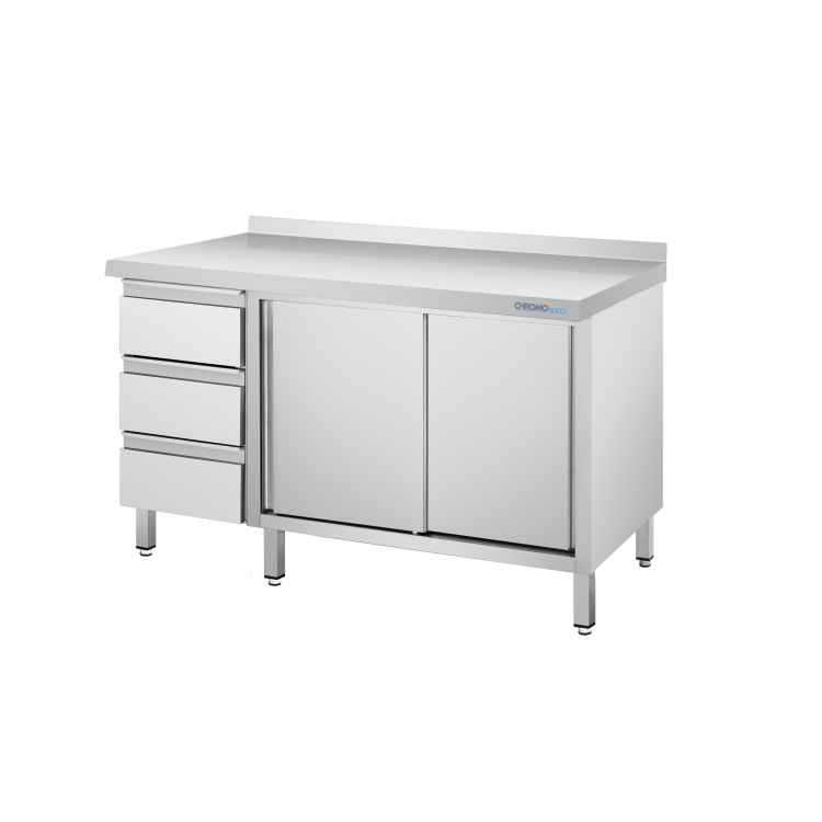 ARBEITSSCHRANK MIT SCHIEBETÜREN UND SCHUBLADENBLOCK LINKS, MIT TISCHPLATTE. Tischplatte (50 mm) aus CNS 18/10, schalldämmend unterfüttert und mit umlaufendem Profil verstärkt. Mit Aufkantung hinten 50 mm. Unterbau aus CNS 18/10, 4-seitig geschlossen, mit einem höhenverstellbarem Zwischenfach, frontseits doppelwandige schallgedämmte Schiebetüren und einem fest eingeschweißten Boden. Links ein Schubladenblock mit 3 Kastenschubladen (GN 2/3), mit integrierter Griffleiste, Auszüge aus Edelstahl, Nutzhöhe je 150 mm. Arbeitshöhe 850-900 mm, variabel einstellbar. Niveauausgleich von -5 mm / +10 mm möglich. Abmessungen unverpackt (LxTxH) 1400x600x850/900 mm.