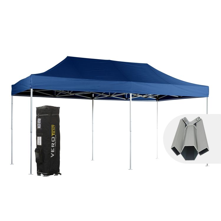 Starkes Alu Faltzelt 3x6m mit Dach. Ideal für längere oder gelegentliche Verwendung bei jedem Wetter. Seitenteile, Fotodruck, Beleuchtung uvm verfügbar. 100% wasserdicht. Massives Zeltgestell für den Dauereinsatz zB im Gastgarten oder als Seminarpavillon. Aufbau mit dem beliebten Zugring auf Bodenhöhe. 4-fache Höhenverstellbarkeit. Die Hexagon Standbeine aus eloxiertem Aluminium mit 56 mm Durchmesser haben eine Wandstärke von 2 mm. Gerilltes Profil, starke Scheren. Stranggepresste Aluminiumverbinder mit Deckkappen aus Kunststoff als Planenschutz. Sämtliche Ersatzteile verfügbar. Einfache Reparatur, da sämtliche Teile verschraubt. Dach und Seitenteile absolut wasserdicht, auch bei langem und starkem Regen. Supratex 600D: High-Tech Material aus fünf Schichten, u.a. PU-Beschichtung für einfache Reinigung. Wasserdichtheit durch versiegelte Nähte mit Spezialband. Lange Farbechtheit durch durchgefärbten Faden und UV-Stabilisierung. UV-Schutz 50+. B1 brandhemmend. Bedruckbar. Lange Nutzungsdauer der Dachplane durch Scheuerschutz-Verstärkungen an allen wichtigen Stellen. Inklusive Tragetasche Premium, für Faltpavillon inkl. Dach. Einfaches Einpacken ohne Anheben. PVC-verstärkte Ecken. Gutes Tragesystem. Kein Herausrutschen.Inklusive Abspannungs- und Verankerungsset bestehend aus Heringen und Seilen.Zubehör: Gewichte aus Stahl, mit Sand oder Wasser befüllbar, Verankerung. Bedruckung mit Logo oder Foto, Seitenteile, Beach-Flags, Beleuchtung, die immer am Gestell bleiben kann uvm.Gestell: Aluminium eloxiert- 6 Standbeine- Durchgangshöhe 1,70 - 2 m- HEX-Aluminiumsteher 58mm x 2 mm Wandstärke- Aluminium Verbinder, alle verschraubt- Aufbau mit Zugring- Metallfußplatte verschraubt- Scherenprofil 17x35mm, Wandstärke 1,7mm- Ersatzteile erhältlichDach: Premium Material Supratex, Polyester 600D- Aufbau aus 5 Schichten, inkl. PU Beschichtung- 100% wasserdicht- versiegelte Nähte- UV stabilisiert 50+- brandhemmend nach Norm EN13501-1, Klasse B-s1,d0- abwischbar- beidseitig bedruckbar