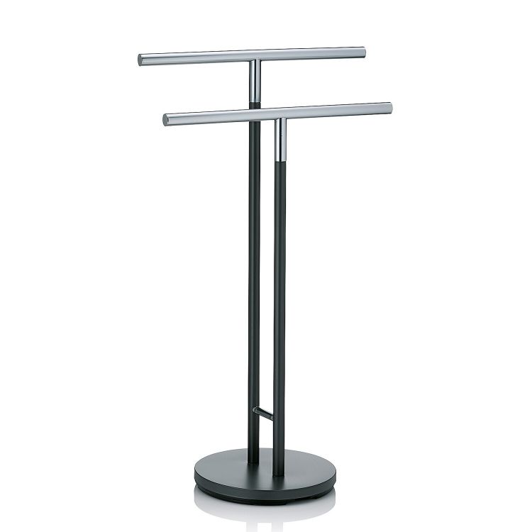 Geradlinig & edel – der Handtuchhalter Sinerio aus MetallIhnen fehlt noch ein Handtuchständer und Sie möchten keine Fliesen anbohren? Dieser edle Ständer mit den zwei Haltestreben verschafft Abhilfe. Ob kleine oder große Handtücher – alle finden genügend Platz und Luft zum Trocknen.Die Kombination von mattiertem Metall und der anthrazitfarbenen Pulverbeschichtung wirkt sehr harmonisch zum geradlinigen Design des Ständers. Wichtig: die Bodenplatte ermöglicht einen kippsicheren Stand.Ergänzend zum Handtuchhalter gibt es innerhalb der Serie Sinerio von Kela einen Rollwagen, einen Badezimmerständer, eine Toilettengarnitur und einen Herrendiener.