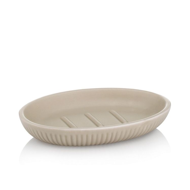 Seifenschale Adele aus Keramik in der Farbe Offwhite in elegantem Design Die Seifenschale Adel hat eine ovale Form und sieht mit ihrer streifen Struktur in erdigen Tönen sehr elegant aus. Sie ist in drei erdigen Farbtönen erhältlich, welche sich perfekt in das Badezimmer eingliedern. Die Serie Adele von kela gibt es in dem Farben Offwhite, Wolkenrosa und Silbergrau. Zu der Badaccessoires-Serie gehören eine Seifenschale, ein Becher, ein Seifenspender und eine offene WC-Garnitur.