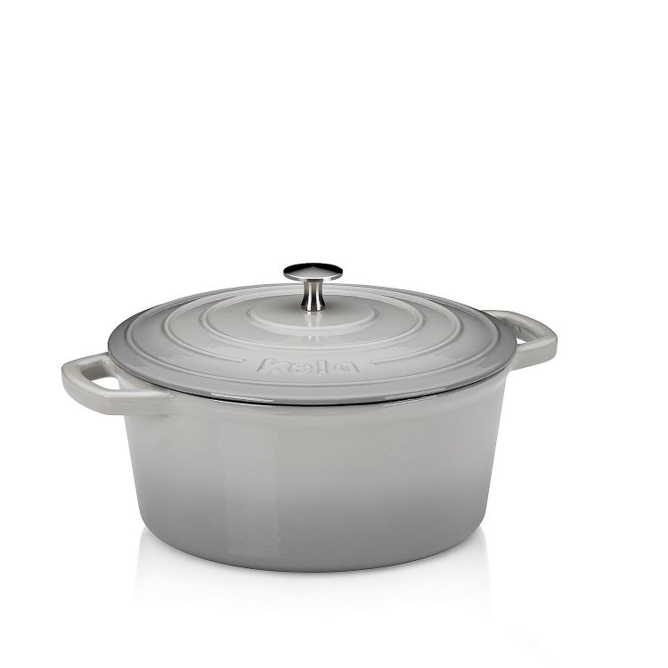 Trendiges Kochgeschirr mit langer Lebensdauer aus der kela-Serie Calido: Der flache, runde Bräter in modernen Farben mit Deckel. Dieser Bräter ist aus Gusseisen und innen emailliert in beige. Der Bräter eignet sich bestens dazu Fleisch scharf anzubraten (bis 300° C) und für Schmorgerichte, welche lange im eigenen Saft schmoren sollen. Der Bräter ist Teil einer umfangreichen Kochgeschirr-Serie!