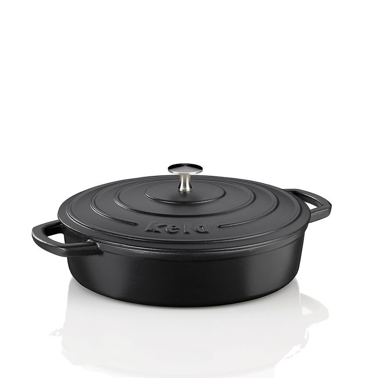 Trendiges Kochgeschirr mit langer Lebensdauer aus der kela-Serie Calido: Der flache, runde Bräter in modernen Farben mit Deckel. Dieser Bräter ist aus Gusseisen und innen emailliert in beige. Der Bräter eignet sich bestens dazu Fleisch scharf anzubraten (bis 300° C) und für Schmorgerichte, welche lange im eigenen Saft schmoren sollen. Der Bräter ist Teil einer umfangreichen Kochgeschirr-Serie!