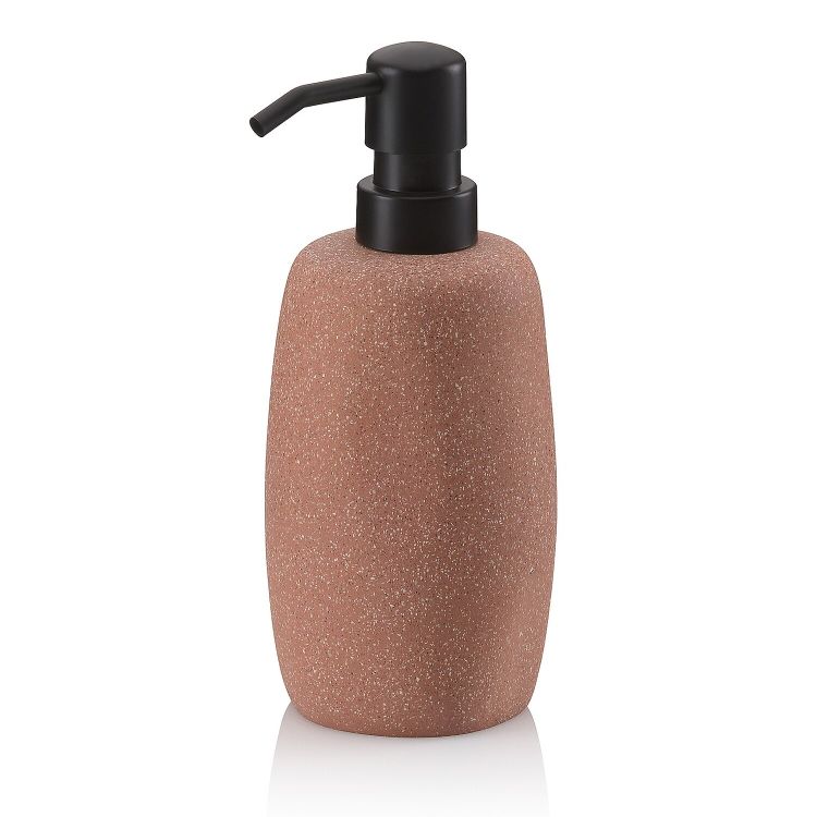 Seifenspender Roda in beiger Steinoptik, hergestellt aus Zement. Bei einer Höhe von 18 cm hat der Seifenspender ein Volumen von 200 ml. Die optisch optimal zum Spender passende Pumpe besteht aus Kunststoff.