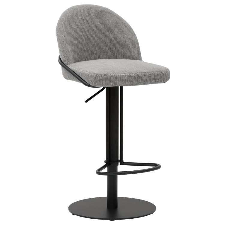 Gestell pulverbeschichtet schwarz, bequem gepolsterte Sitzschale mit dekorativem Kreuzstich an Sitz und Rücken, Sitz mit Metalleinfassung schwarz, stufenlose Höhenverstellung durch Gasfeder, 360° Drehmöglichkeit, Design-Fußstütze, Sitzhöhe 55 - 80 cm.
