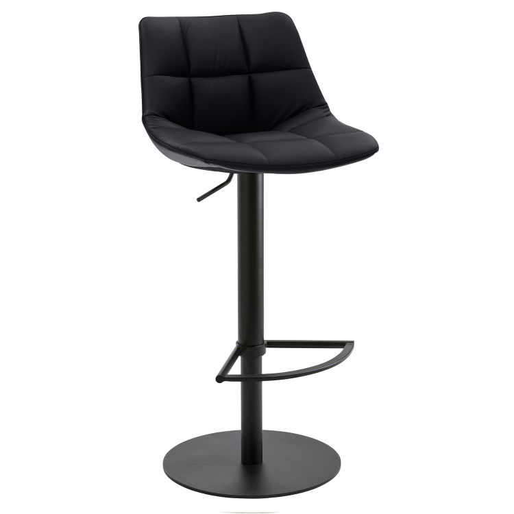 Gestell pulverbeschichtet schwarz, bequem gepolsterter Sitz mit attraktiver Rauten-Steppung, stufenlose Höhenverstellung durch Gasfeder, 360° Drehmöglichkeit, Design-Fußstütze, runder Bodenteller, Sitzhöhe 53,5-78 cm. Bezug: Mikrofaser als perfekte Alternative zu Kunstleder - lederähnliche Optik und Narbung, spezielle „soft touch“ Oberfläche mit samtig weicher Haptik, strapazierfähig, atmungsaktiv und pflegeleicht.