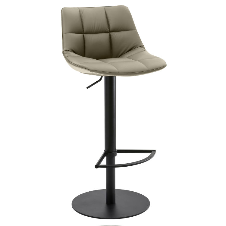 Gestell pulverbeschichtet schwarz, bequem gepolsterter Sitz mit attraktiver Rauten-Steppung, stufenlose Höhenverstellung durch Gasfeder, 360° Drehmöglichkeit, Design-Fußstütze, runder Bodenteller, Sitzhöhe 53,5-78 cm. Bezug: Mikrofaser als perfekte Alternative zu Kunstleder - lederähnliche Optik und Narbung, spezielle „soft touch“ Oberfläche mit samtig weicher Haptik, strapazierfähig, atmungsaktiv und pflegeleicht.