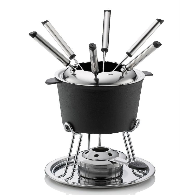 Fondue-Set Comore aus Gusseisen und Edelstahl – schick & besondersEin tolles Design zu einem unschlagbaren Preis. Das Fondue Comore aus dem Hause Kela macht dies möglich und garantiert für gemütliche Fondue-Abende in kleinerer Runde. Der Topf aus emailliertem Gusseisen hat ein Füllvolumen von 0,6 bis 0,8 Liter Öl oder Brühe. Der schwarze Topf wird mit dem Spritzschutz und den individuellen Fonduegabeln aus Edelstahl aufgelockert. Das Rechaud und der Bodenteller aus verchromtem Metall bilden den stimmigen Abschluss. Der Clou: die Fonduegabeln sind durch die Ringmarkierung unterschiedlich. Das 11-teilige Fondue-Set von Kela enthält: Topf, Spritzschutz, Rechaud, Pastenbrenner (bitte nur mit Sicherheitsbrennpaste befüllen), Bodenteller, 6 Fonduegabeln.