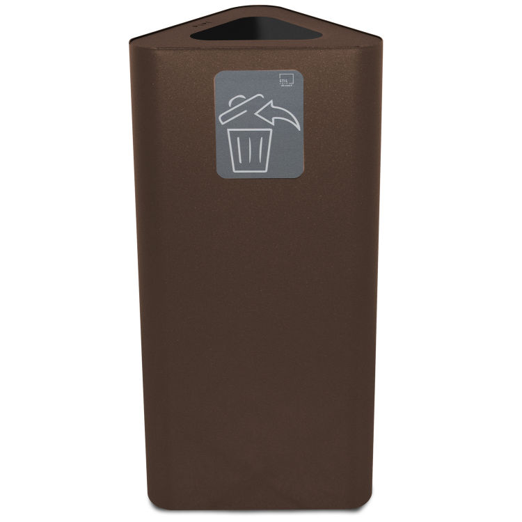 Eleganter und funktioneller dreieckiger Behälter für die Abfallsammlung in Innenräumen, komplett aus grau lackiertem Stahl. Der Einwurf der Säcke erfolgt über einen Ring aus Technopolymer mit Sackverriegelungsfunktion und verzinkter Verriegelungsstange. Magnetisches Piktogramm mit dem Symbol "undifferenziert", das sich leicht an der Vorderseite des Behälters anbringen und zur gründlichen Reinigung abnehmen lässt. Bodenschonende Technopolymer-Füße