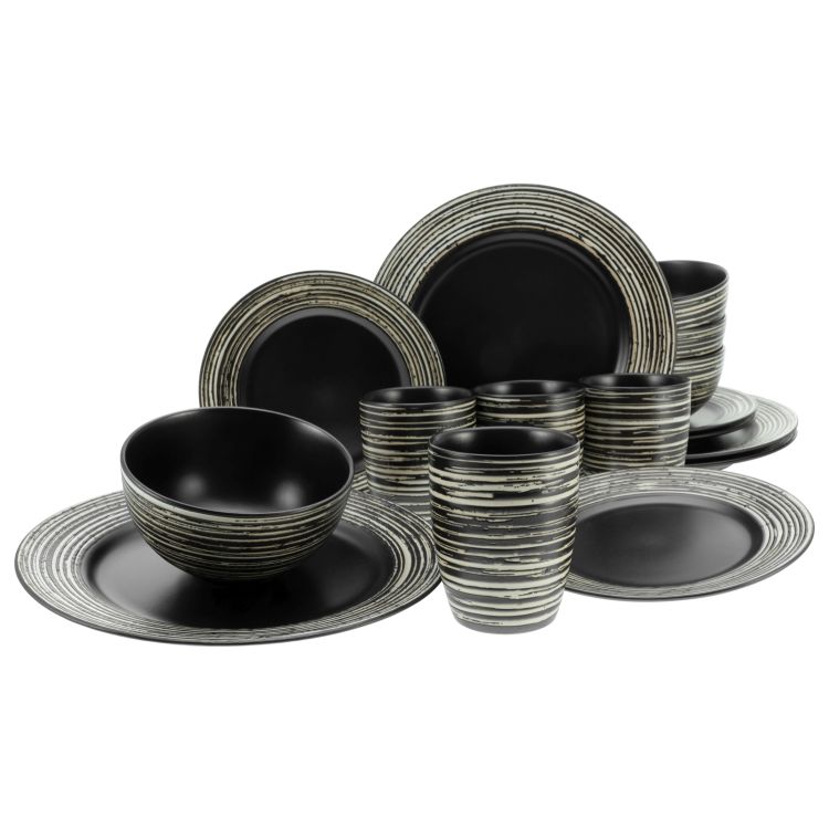KOMPLETTSET: Das 16-teilige Kombiservice beinhaltet 4 Speiseteller 27 cm, 4 Dessertteller 20 cm, 4 Mehrzweckschalen 18 cm und 4 riesige Mehrzweckbecher 40 cl. MEDITERRANER FLAIR: Handwerklicher, unregelmäßiger und organischer Look präsentieren sich auf einer modernen schwarzen Fahnenform mit einem fein gearbeiteten weißen Relief. SPEZIALGLASUR: Die schwarze, seidenmatte Glasur sorgt in Verbindung mit dem weißen Relief für einen einzigartigen Look mit gewollten Unregelmäßigkeiten – somit wird jedes Stück zum Unikat. NACHHALTIGE FREUDE: Das Geschirr begleitet Dich durch den ganzen Tag. Es ist außergewöhnlich lang haltbar und selbstverständlich auch spülmaschinen- und mikrowellengeeignet. MARKENQUALITÄT: Unser Geschirr wird in Deutschland konzipiert und in ausgewählten Premiumfabriken produziert, um Dir die Qualität zu liefern, die Du Dir für Dein Zuhause wünschst.