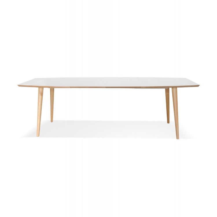 Entdecken Sie die erweiterbare Esstischlösung im skandinavischen Design, die Ihre Gastronomie oder Ihren Veranstaltungsbereich aufwertet. Mit ihrer eleganten weißen Struktur aus Buchenholz bringt dieser Tisch eine moderne und einladende Atmosphäre in jedes Restaurant, Café oder Eventbereich.
