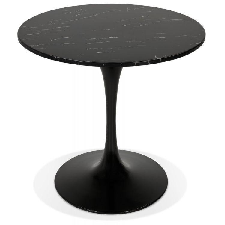 Mit einem Durchmesser von 90 cm bietet sie die perfekte Größe für kleine Räume und bietet Platz für bis zu 5 Gäste. Die Tischplatte aus schwarzem Stein mit marmoriertem Effekt und feinen Adern verleiht Ihrem Essbereich eine zeitlose Eleganz.