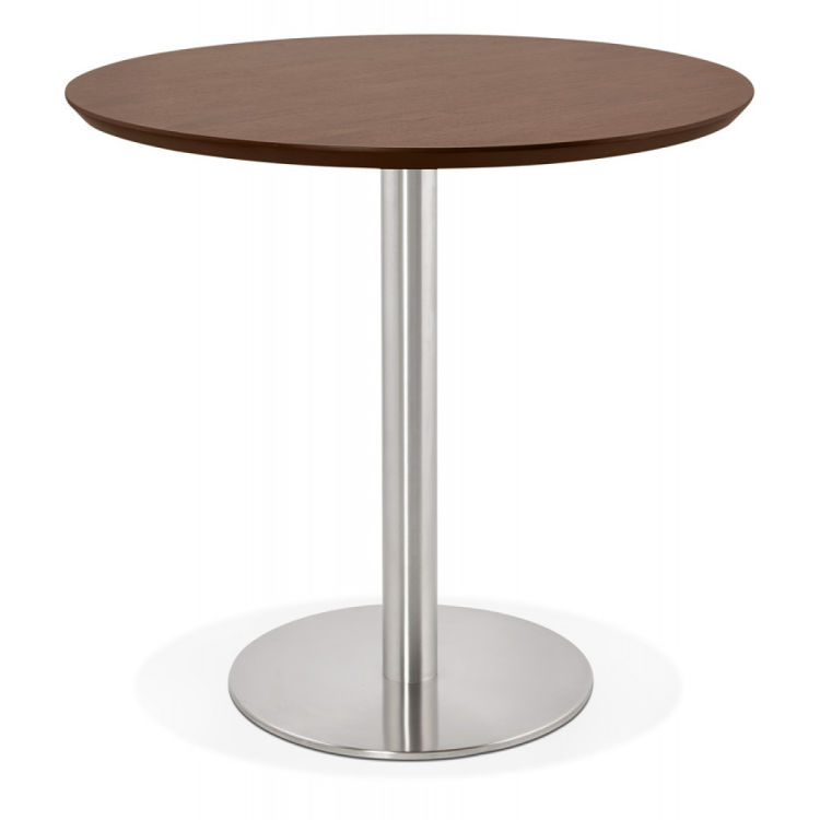 Der Tisch verfügt über eine MDF-Platte mit Nussbaum-Finish, die nicht nur stilvoll aussieht, sondern auch pflegeleicht und langlebig ist. Der stabile Fuß aus gebürstetem Stahl sorgt für Robustheit und eine ansprechende Ästhetik, die sich nahtlos in verschiedene Einrichtungskonzepte einfügt.