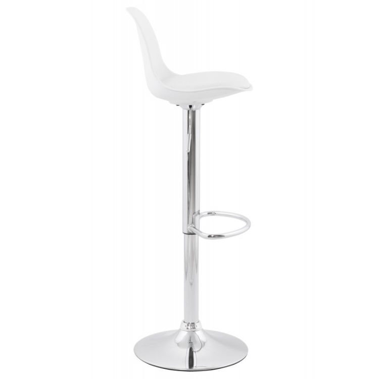 Mit seiner gepolsterten Sitzfläche und Rückenlehne aus weißem Kunstleder bietet dieser Hocker optimalen Komfort, selbst bei längeren Sitzungen. Die mittelhohe Rückenlehne sorgt für zusätzlichen Halt und verleiht dem Hocker gleichzeitig ein elegantes, unaufdringliches Design. Die robuste Struktur aus verchromtem Metall sorgt für Stabilität und Langlebigkeit, ideal für den intensiven Einsatz in Bars, Restaurants oder Lounges.