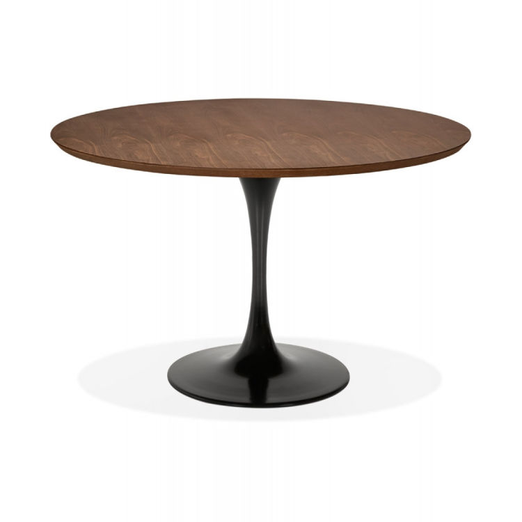 Die großzügige Tischplatte aus massivem Nussbaum mit einem Durchmesser von 120 cm ruht leicht auf einem stabilen, zentralen Metallgestell in Schwarz, was einen auffälligen und modernen Kontrast schafft.