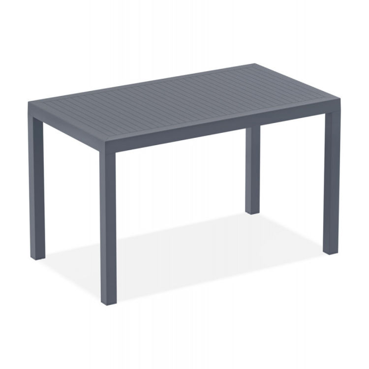 Hergestellt aus robustem, dunkelgrauem Kunststoff, ist dieser Tisch nicht nur ästhetisch ansprechend, sondern auch langlebig und widerstandsfähig gegen Witterungseinflüsse und UV-Strahlen. Die Reinigung ist unkompliziert und erfordert lediglich einen Wisch mit einem Schwamm.
