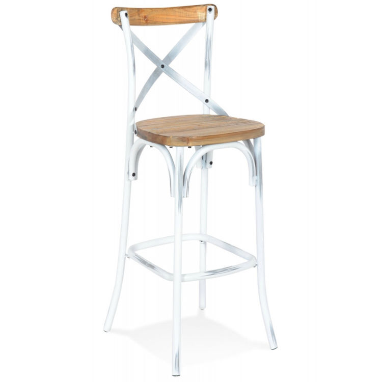 Die ergonomische Sitzhöhe von 75 cm und die komfortable Rückenlehne mit Kreuzstreben bieten Ihren Gästen nicht nur Stil, sondern auch optimalen Komfort, selbst bei längeren Aufenthalten. Die harmonische Kombination aus natürlichem Holz und patiniertem Weiß verleiht dem Hocker einen zeitlosen Charme, der sich nahtlos in verschiedene Einrichtungskonzepte integrieren lässt.