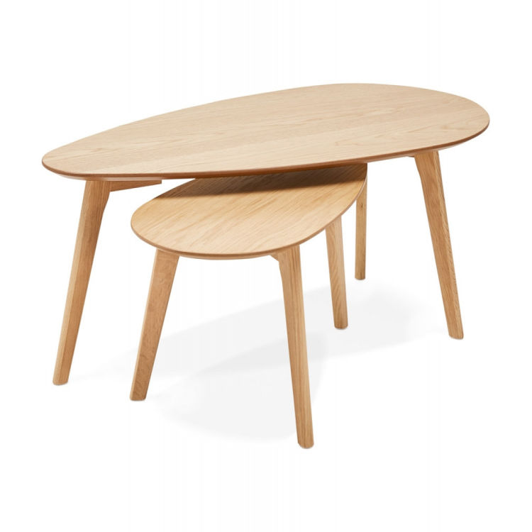 Erleben Sie eine neue Dimension des Designs mit den eleganten, stapelbaren Beistelltischen aus Holz in natürlicher Ausführung. Diese zwei einzigartigen, dreieckig geformten Tische zeichnen sich durch ihre klare Linienführung und die hochwertige Eichenfurnier-Oberfläche aus, die sich nahtlos in jede Inneneinrichtung einfügen lassen.