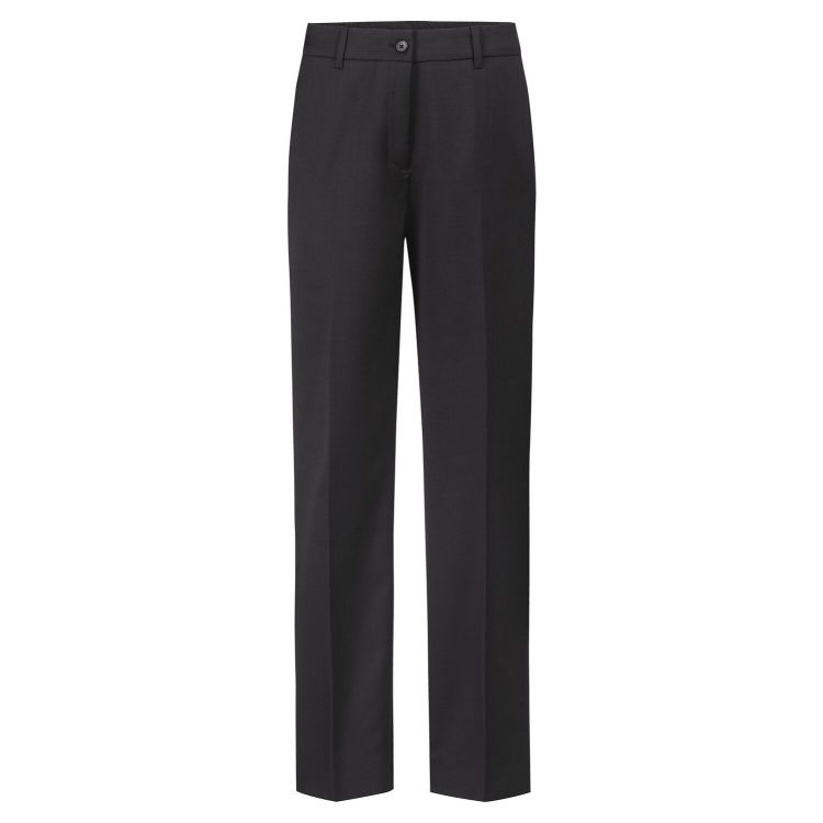 hohe Leibhöhe, Gummibund hinten, gerader Beinverlauf, 2 Flügeltaschen, 1 blinde Gesäßleistentasche, Vorderhosenfutter, 52 % Polyester, 46 % Schurwolle, 2 % Elasthan