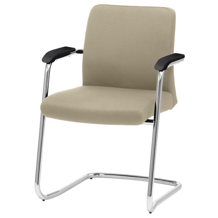 Freischwinger, Gestell Chrom, Sitz und Rücken gepolstert, Armauflagen Kunststoff schwarz, transparente Universalgleiter, Sitzhöhe 48 cm. Bezug: weiche Mikrofaser mit angenehmer Haptik und einer rustikalen, lederähnlichen Optik.