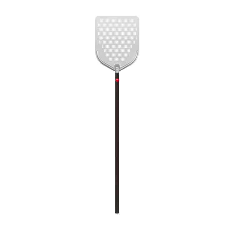 Eloxierte Pizzaschaufel aus Aluminium, Größe 37 cm, Schaufelstärke 2 mm. Die Perforationen lassen das Mehl abfließen und sorgen für einen sauberen Ofen. Schwarzer Aluminiumgriff. Praktisch und leicht, um die Kontrolle und Sicherheit bei der Handhabung der Pizza während des Backens zu ermöglichen, ein wesentliches Element in Pizzerien und Restaurants. Der lange Stiel bietet einen bequemen Griff für eine einfache und sichere Handhabung der Schaufel.