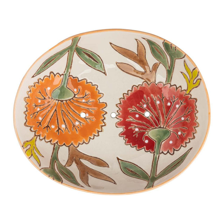 Mit dieser Seifenschale genießt man zu jeder Jahreszeit einen Hauch von Sommer! Das handgestempelte Blumenmotiv ist immer wieder hübsch anzusehen und sorgt für gute Laune. Dank der Herstellung aus Steingut hat die Schale mit praktischen Ablauflöchern eine langlebige, robuste Qualität. B 13 x T 11 x H 4 cm.