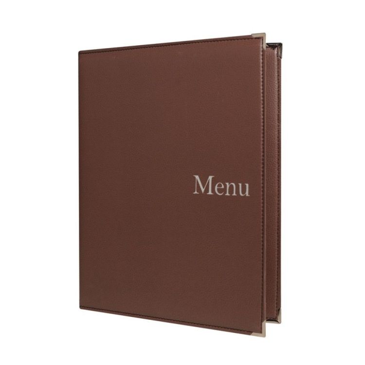 Hergestellt aus Kunstleder mit einer Textur aus genarbtem Echtlederimitat, bietet dieser Menüschutz ein elegantes und robustes Aussehen. Die Schutzecken und die inneren Schrauben aus silberfarbenem Metall verleihen einen Hauch von Raffinesse und sorgen für zusätzliche Stabilität.