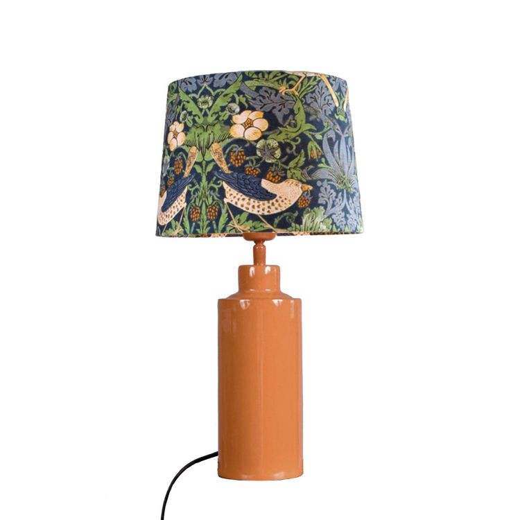 Solo-Leuchtensockel in hochglänzender denimblauer Ausführung mit einem zylinderförmigen weißen Schirm. Der Schirm ist 25 cm breit und 25 cm hoch und hat eine E27-Fassung. Der Lampenfuß ist 32cm hoch und die Gesamthöhe beträgt 55cm. 1,7m schwarzes Kabel mit Schalter und flachem EU-Stecker. E27-Fassung. Max. 40W. IP20. Leuchtmittel nicht enthalten.