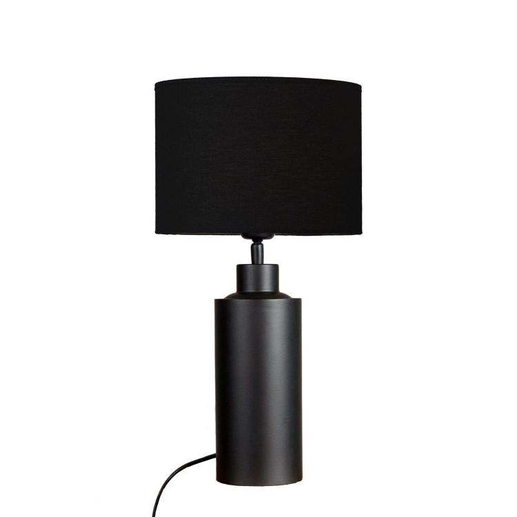 Solo-Leuchtensockel in hochglänzender denimblauer Ausführung mit einem zylinderförmigen weißen Schirm. Der Schirm ist 25 cm breit und 25 cm hoch und hat eine E27-Fassung. Der Lampenfuß ist 32cm hoch und die Gesamthöhe beträgt 55cm. 1,7m schwarzes Kabel mit Schalter und flachem EU-Stecker. E27-Fassung. Max. 40W. IP20. Leuchtmittel nicht enthalten.