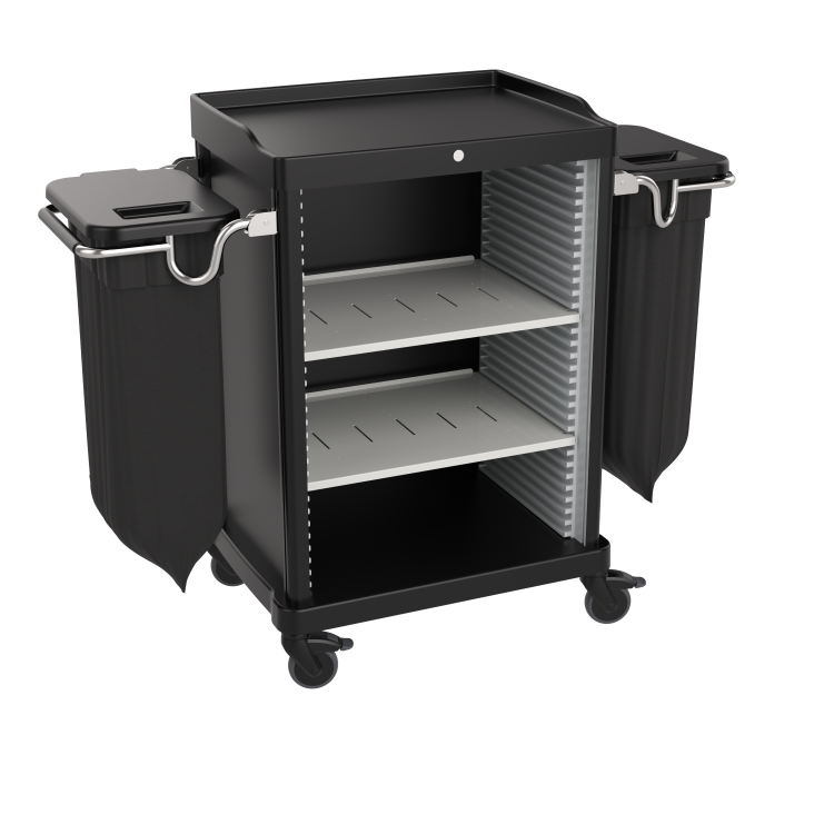 Erleben Sie höchste Effizienz und Zuverlässigkeit in Ihrem Housekeeping-Betrieb mit dem Housekeepingwagen 4-ESSENTIAL-V1 in elegantem Schwarz. Dieser hochwertige Housekeepingwagen, stolz zu 100% Made in Italy, vereint durchdachtes Design mit herausragender Funktionalität, um Ihre täglichen Abläufe zu optimieren.