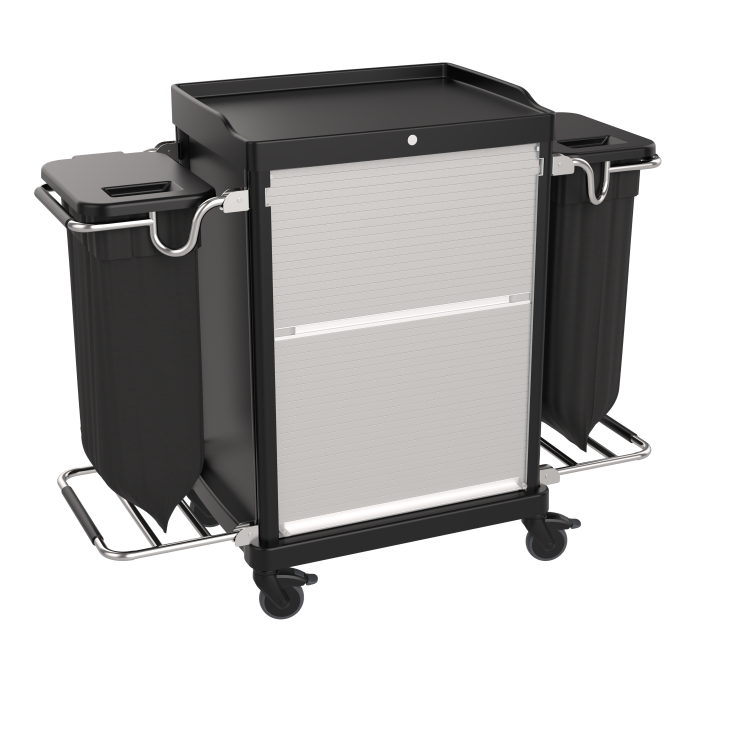 Der Housekeepingwagen 4-ESSENTIAL-V6 in elegantem Schwarz ist die Premium-Lösung für diskretes und sicheres Housekeeping. Als Garant für hohe Qualität und 100% Made in Italy, wurde dieser Wagen für die höchsten Anforderungen an Sicherheit und Effizienz in Hotels und Gastronomiebetrieben entwickelt.