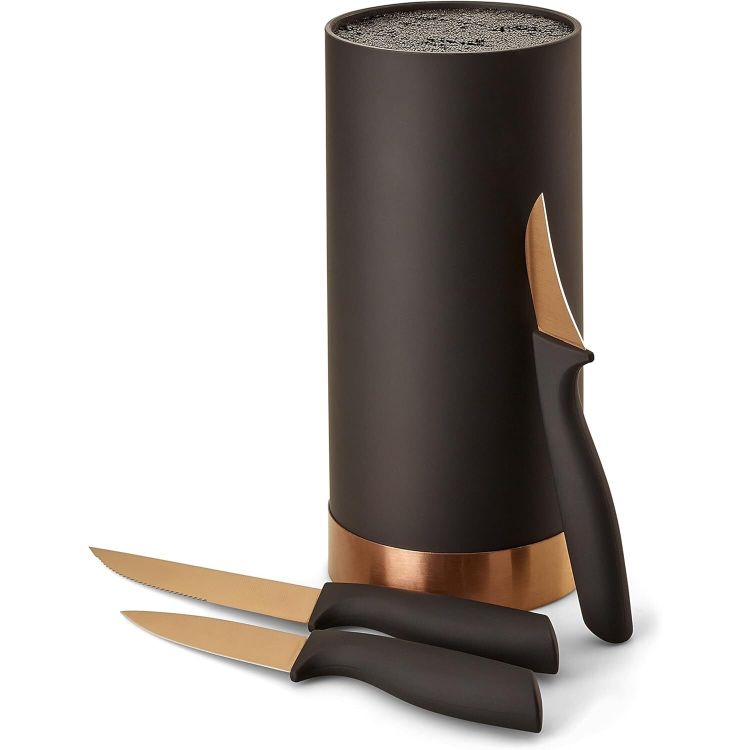 Ideale Ausstattung für jede Küche. Bestückter Messerblock bestehend aus: Universalmesser 13 cm, Schälmesser 6 cm, Obst- und Gemüsemesser 9,5 cm aus hochwertigem Klingenstahl mit einer hochwertigen Edelstahlaplikation in kupfer. Hochwertige Messer: